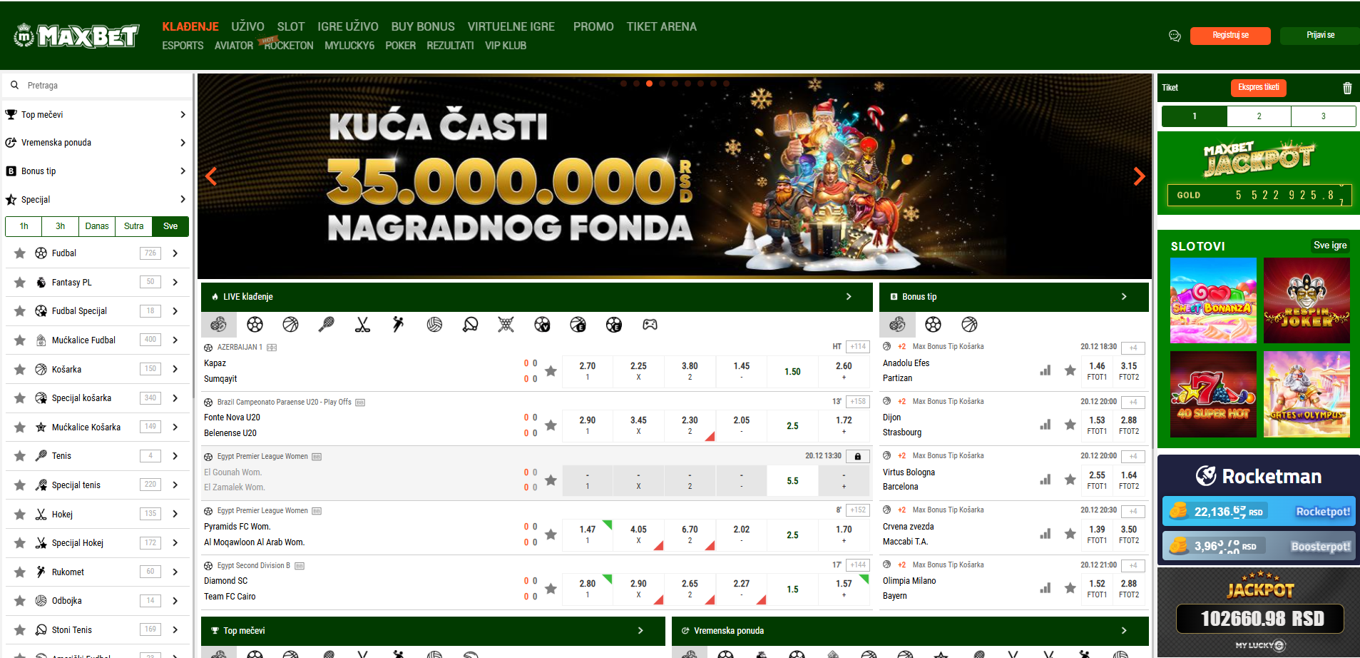• Klađenje prije utakmice: Odaberite tržišta za nadolazeće događaje (pobjeda/poraz, ciljevi, markeri, hendikepi, jedinstvena tržišta)